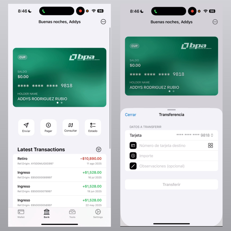 Con KeyCard BBM podrás no solo almacenar tus tarjetas, sino también operar en Transfermóvil, autenticarte en tu banco, desconectar, hacer transferencias bancarias, consultar tu saldo, cambiar límites y más.Novedad en la beta